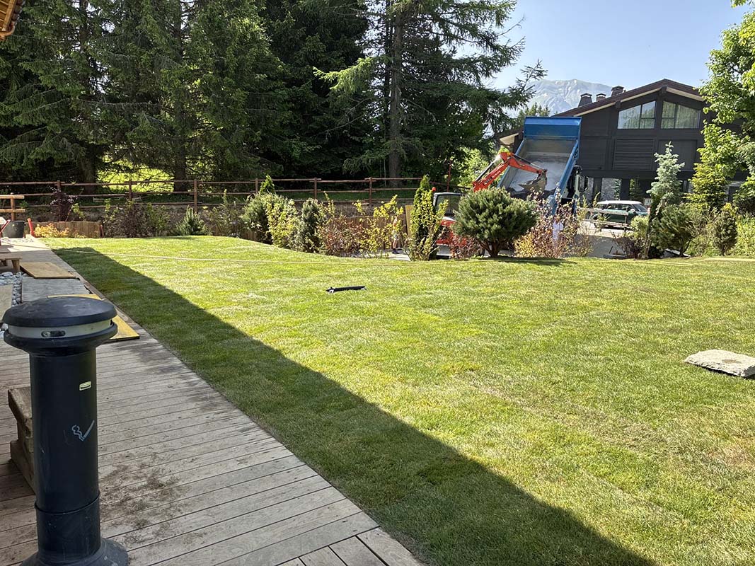 Livraison de 380 m² de rouleaux de gazon naturel frais et prêts à poser, chez notre client à Yvoire en Haute-Savoie.