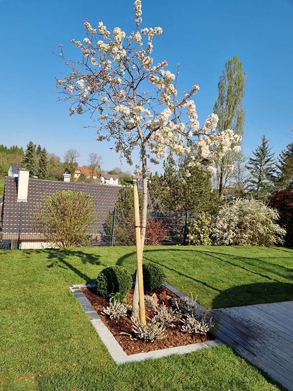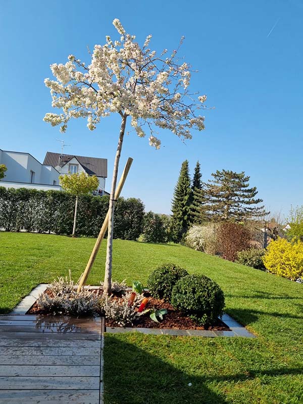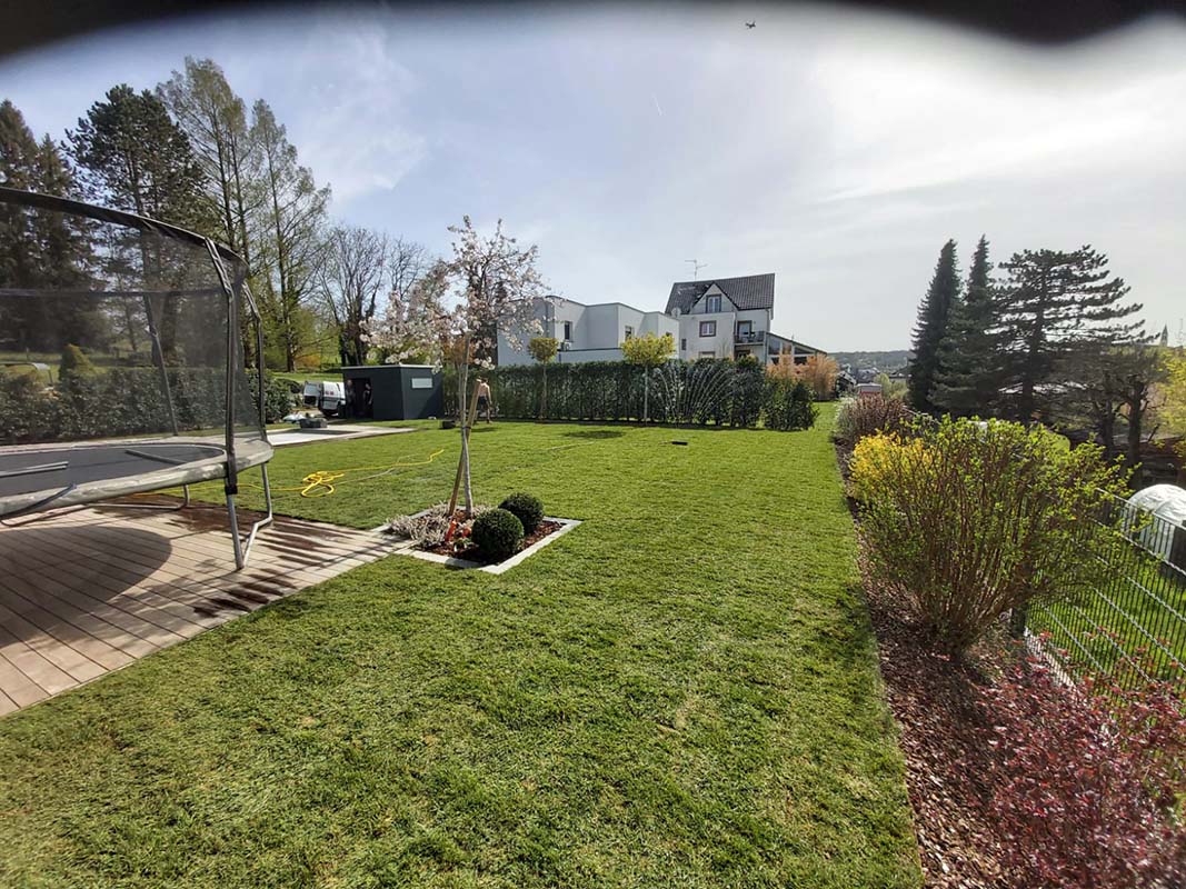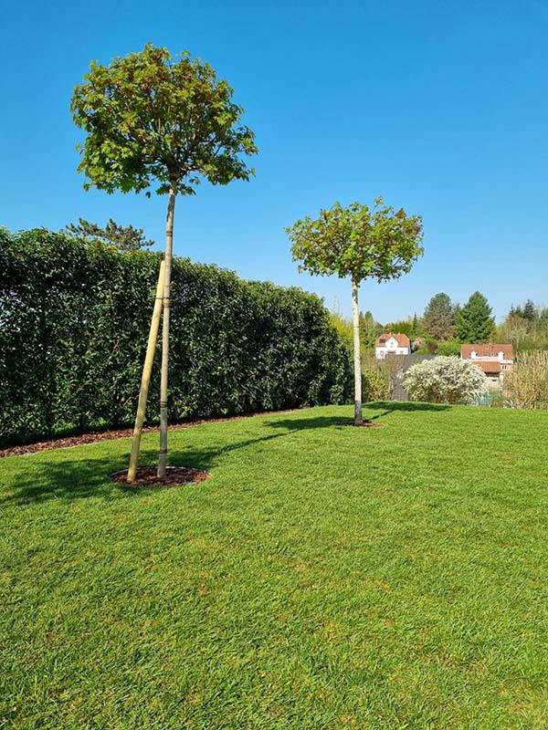 Projet résidentiel à Limonest dans la métropole de Lyon : 400 m² de gazon en rouleaux pour une entrée accueillante.