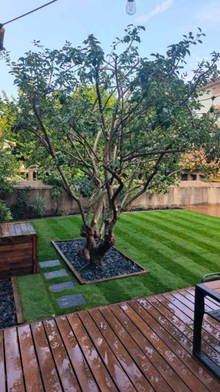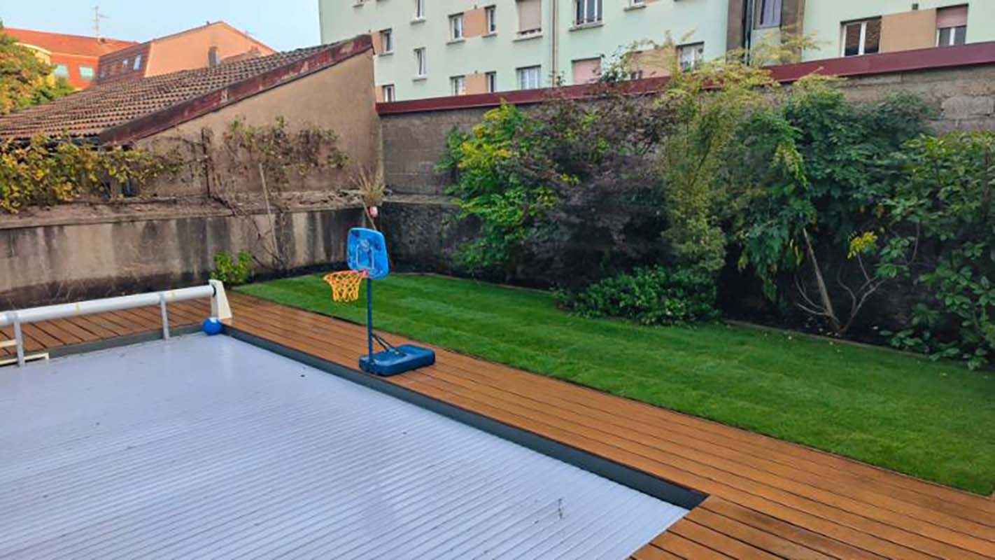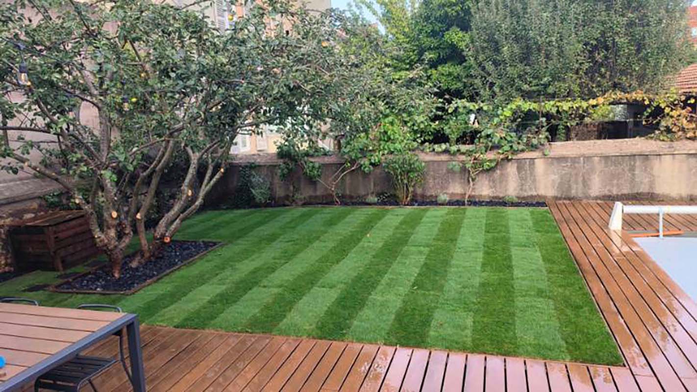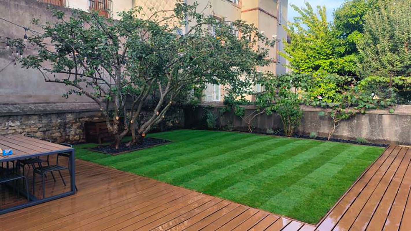 À Avignon, un projet de gazon en rouleaux dans une cour intérieure : 90 m² de pelouse installés en quelques heures.